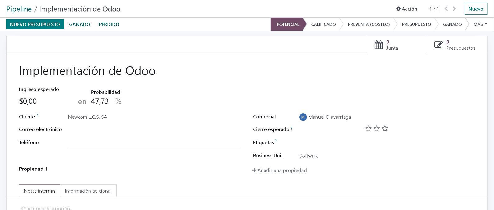- Nombre de la Oportunidad: Ejemplo: "Venta de Solución IT - Cliente X".